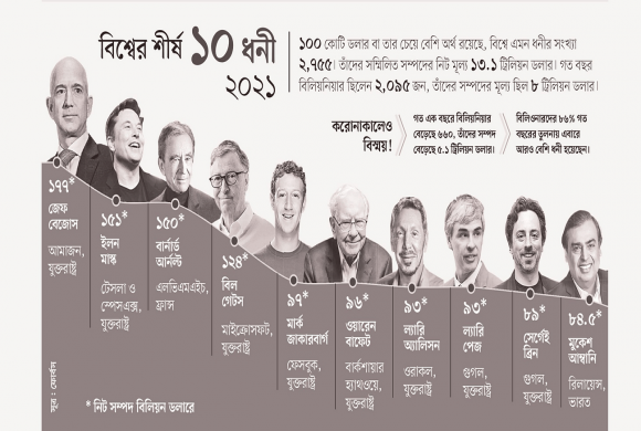 এবার তালিকায় নতুন করে যুক্ত হওয়াদের মধ্যে ৪৯৩ জনই প্রথমবারের মতো বিলিয়নিয়ার হয়েছেন। অর্থাৎ বিশ্বে প্রতি ১৭ ঘণ্টায় একজন ব্যক্তি বিলিয়নিয়ার হয়েছেন। আর গোটা দুনিয়ায় বিলিয়নিয়ারের সংখ্যা বৃদ্ধি পেয়ে ২ হাজার ৭৫৫ জনে উন্নীত হয়েছে। আর তাঁদের সম্মিলিত সম্পদের নিট মূল্য দাঁড়িয়েছে ১৩ দশমিক ১ ট্রিলিয়ন বা ১৩ লাখ ১০ হাজার কোটি মার্কিন ডলার। যুক্তরাষ্ট্রের বহুজাতিক ই-কমার্স প্রতিষ্ঠান আমাজনের প্রতিষ্ঠাতা ও প্রধান নির্বাহী কর্মকর্তা (সিইও) জেফ বেজোস এবারও বিশ্বের শীর্ষ ধনী। তাঁর সম্পদের নিট মূল্য ১৭৭ বিলিয়ন বা ১৭ হাজার ৭০০ কোটি ডলার। ১৫১ বিলিয়ন ডলারের সম্পদ নিয়ে দ্বিতীয় স্থানে উঠে এসেছেন একই দেশের বৈদ্যুতিক গাড়ির কোম্পানি টেসলার চেয়ারম্যান ও সিইও ইলন মাস্ক। ফ্রান্সভিত্তিক বিলাস পণ্যের ব্যবসায়ী বার্নার্ড আরনল্ট ১৫০ বিলিয়ন ডলারের নিট সম্পদ নিয়ে তৃতীয় হয়েছেন।